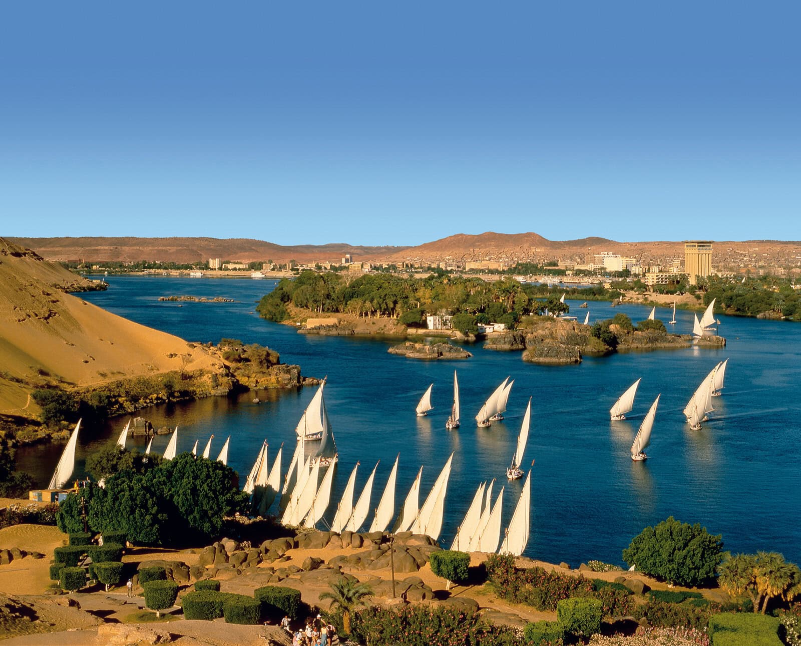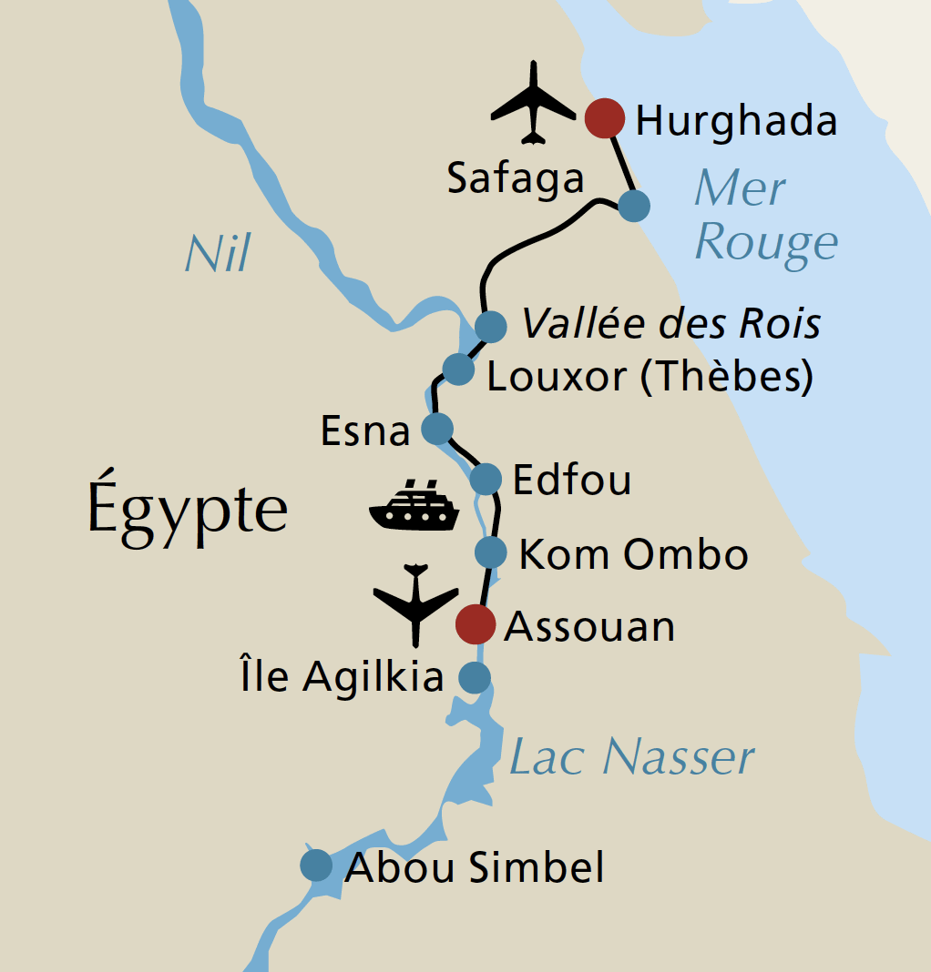 Forfait « Découverte » : ce forfait comprend les visites du temple d‘Horus et du temple de Louxor (patrimoine mondial), y compris les entrées et les visites guidées, une promenade en voilier traditionnel sur le Nil et une excursion d‘une journée entière le 7ᵉ jour vers la ville lagunaire mondaine d‘El Gouna, le joyau de la mer Rouge : seulement 175€* p. pers.